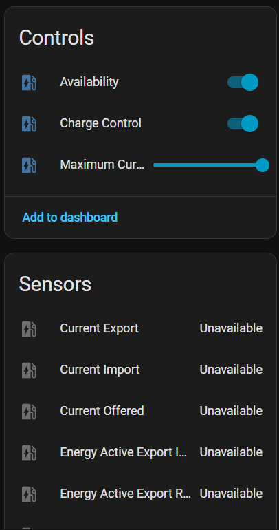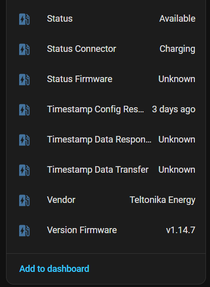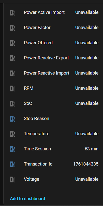 I am trying to add TeltoCharge 11kW (FW 1.14.7) to my Home Assistant home automation platform. I am using the latest OCPP extension from HACS to connect the charger to HA. Basic functionality works fine; however, most of the sensors are not available, which basically renders the integration almost useless because I can neither see real-time info for load balancing nor collect stats for long-term use analysis and optimizations. Only basic controls are available, and even basic meters as voltage, current, and cars’ SoC, are missing. Tried connecting the charger to Monta with the same results - most of the meters are not available. See attached screenshots for details.