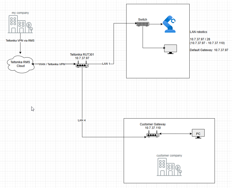 Based on the topology and IP addresses you provided, it appears that the RUT301, Customer Gateway, and LAN robotics devices are all within the same network (10.7.37.X). If that is the case, you should be able to access the LAN robotics devices directly from the customer PC.