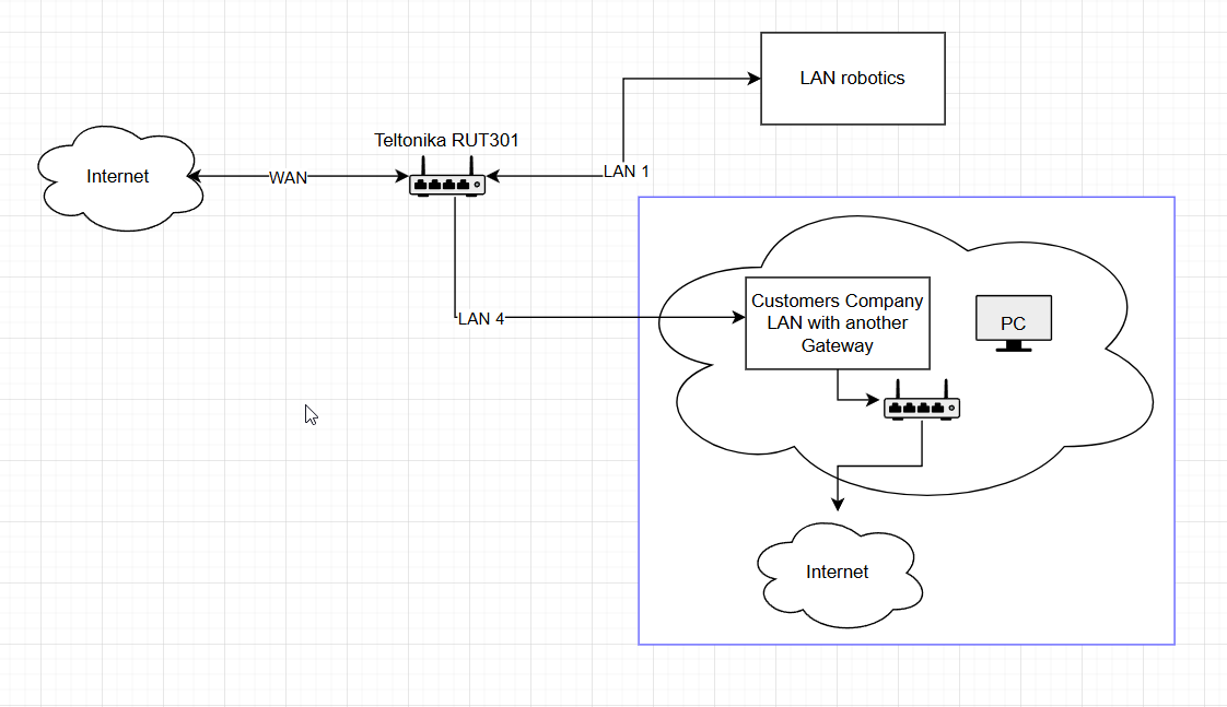 The RUT301 and the “LAN robotics” is managed by us. WAN is provided by the customer.