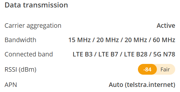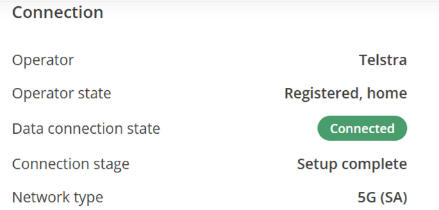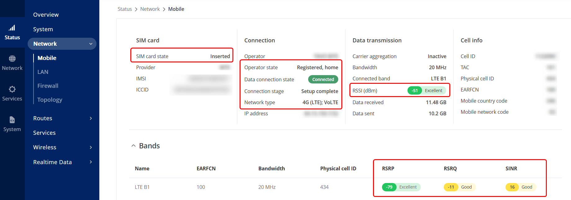 You are indeed correct in regards to the LED status. If possible, could you access the WebUI of the TRB500, and head to Status → Network → Mobile and send me a screenshot? Please blur out your IP addresses, serial numbers, IMEI numbers, ICCID’s, or anything sensitive: