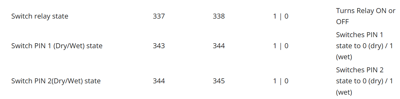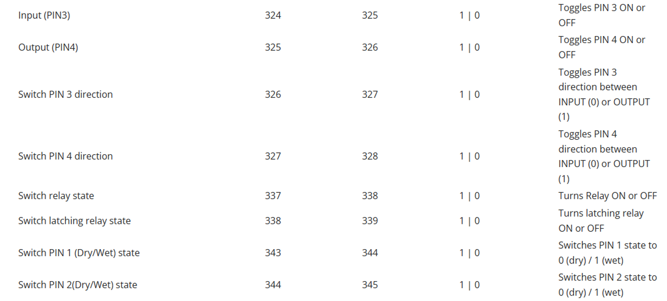 It is similar situation for set parameters.TRB141 device has two relays and more than 2 pins. In the modbus command list, only single relay and only 2 pins are listed: