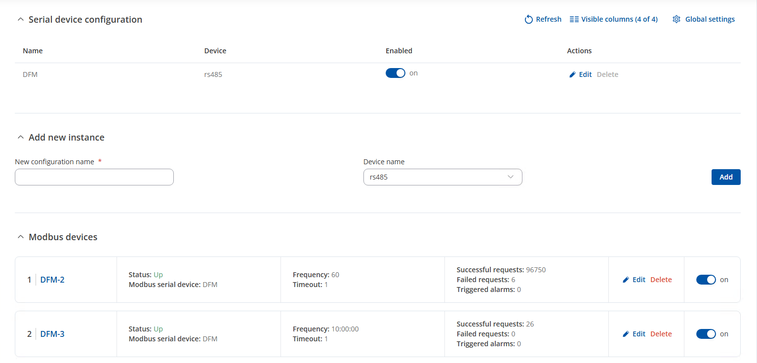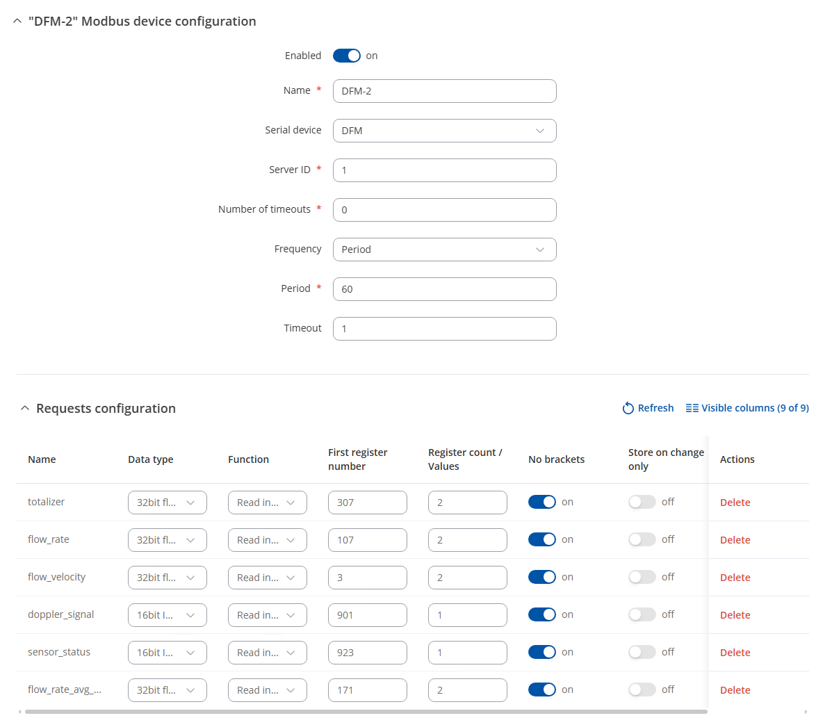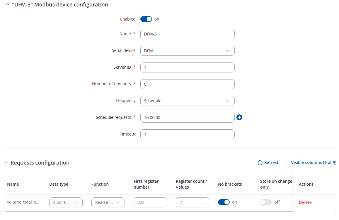 Modbus Serial Client configuration: I have one modbus serial device (DFM) and 2 configurations with different frequency (DFM-2,DFM-3) connected to it. The first one is on 60 seconds period with 6 parameters and the second one is on schedule at 10:00:00 with only one parameter.