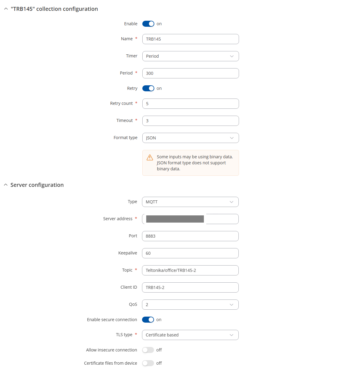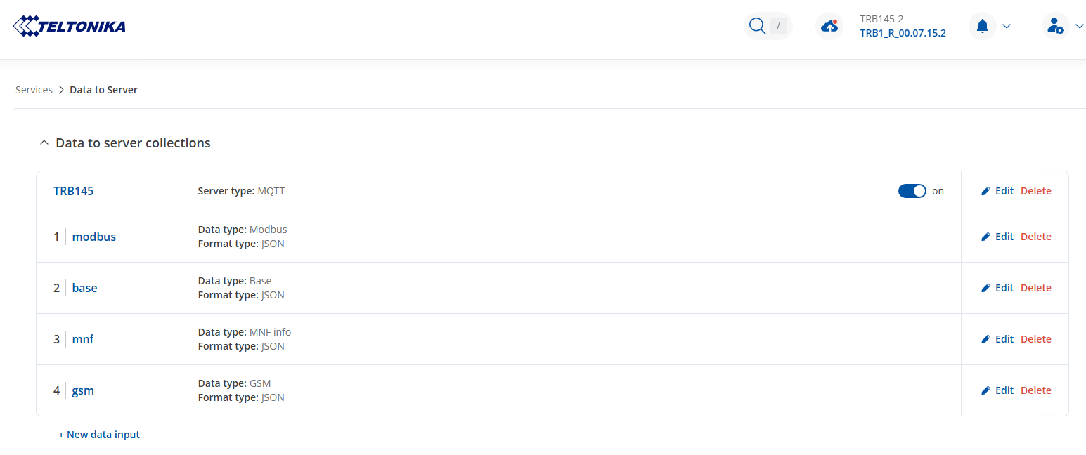 Data to server configuration: type MQTT with 5 min period to send all data collected from modbus parameters.