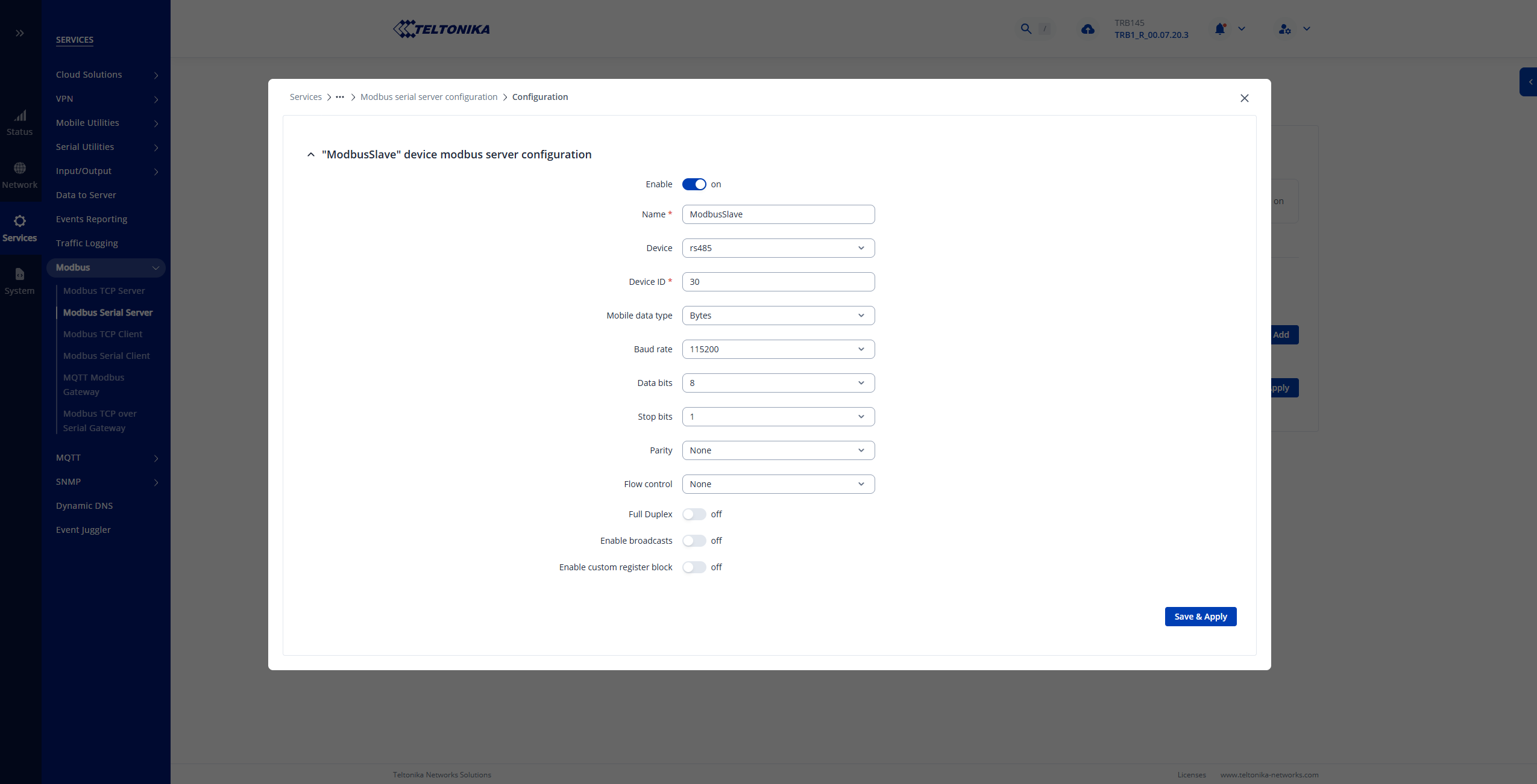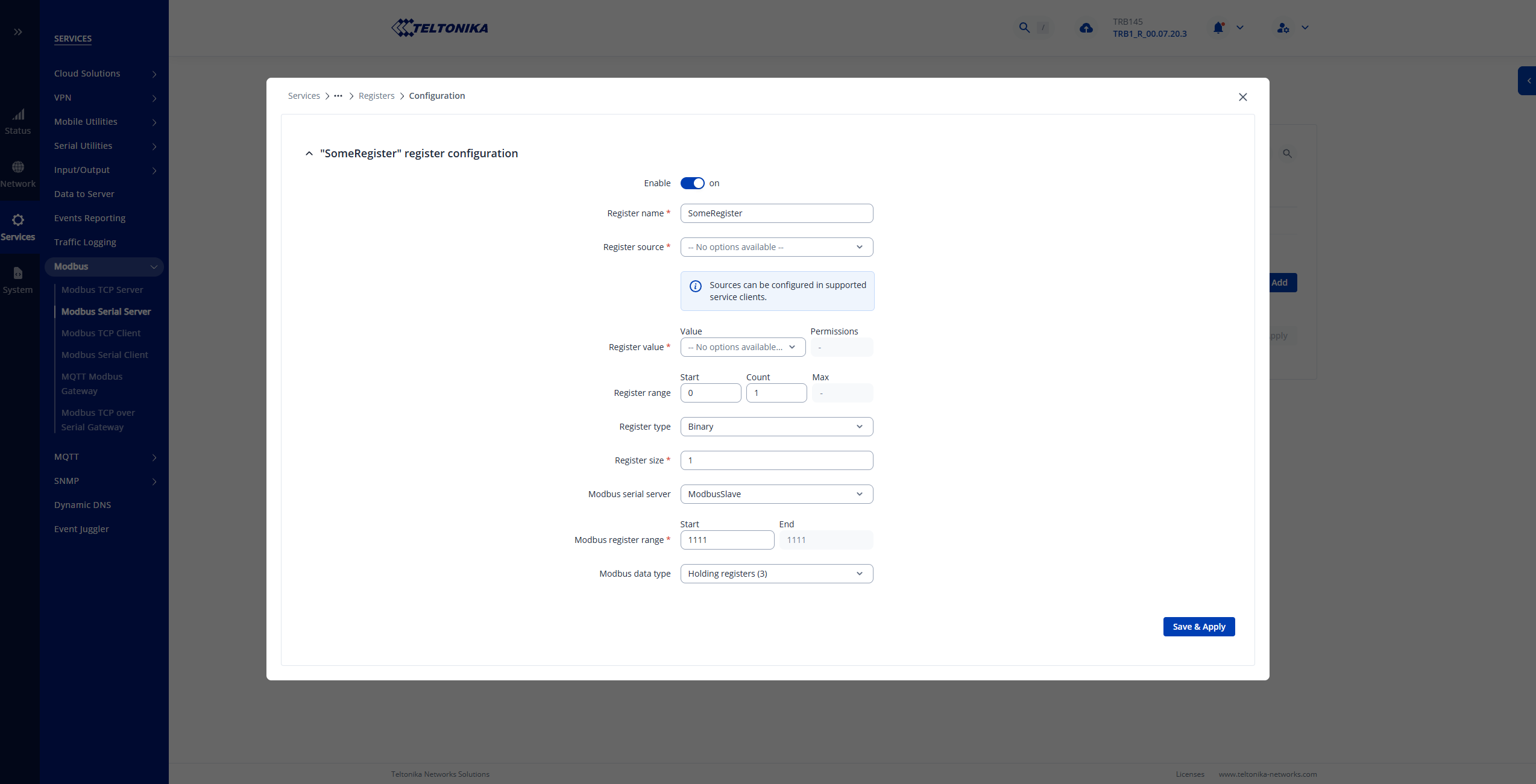 After successfuly creating a modbus serial server, adding a register will require creating and enabling a modbus serial client.
