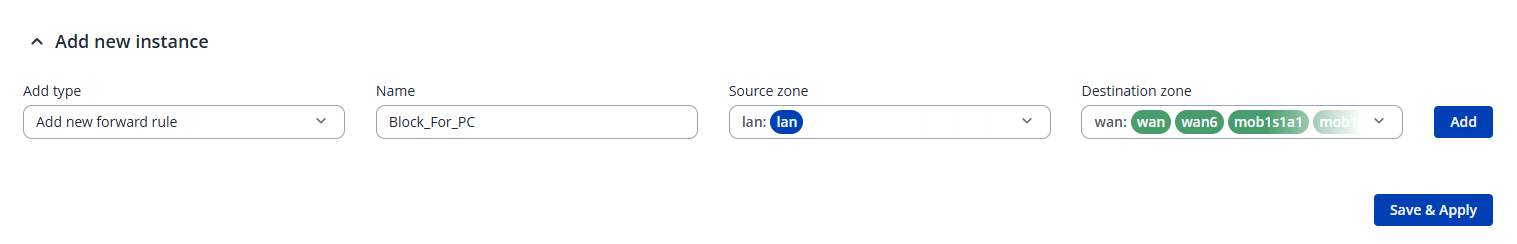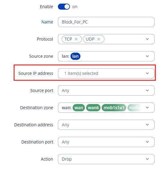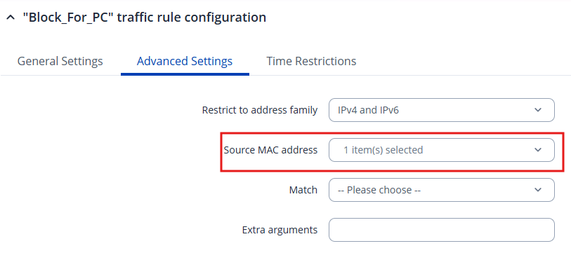 The only things that will differ from the previous traffic rule configuration is that you have to add the Source IP address, select the device that shouldn’t get the internet connection from the gateway from the list there and go to Advanced settings, in the Source MAC address select the same device