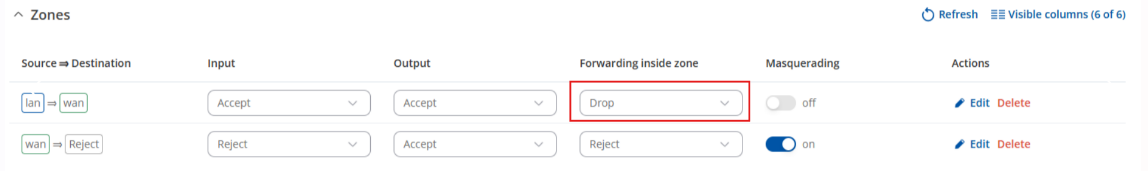 Go to Network → Firewall → Zones, and change the Forwarding inside zone option to Drop