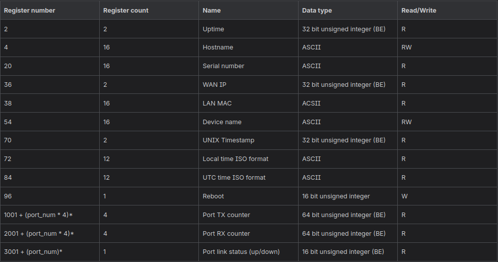 However, I did find that the register range starts at register 3000 for port 1. I did not test all registers, but this is something to keep in mind.