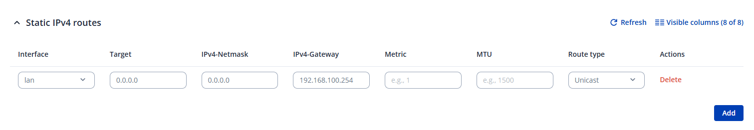 Navigate to Network → Static Routes and add a route as shown in the image below