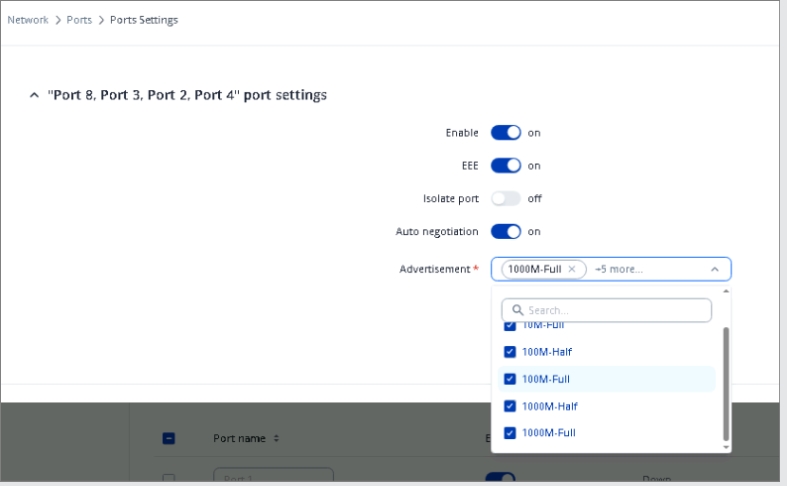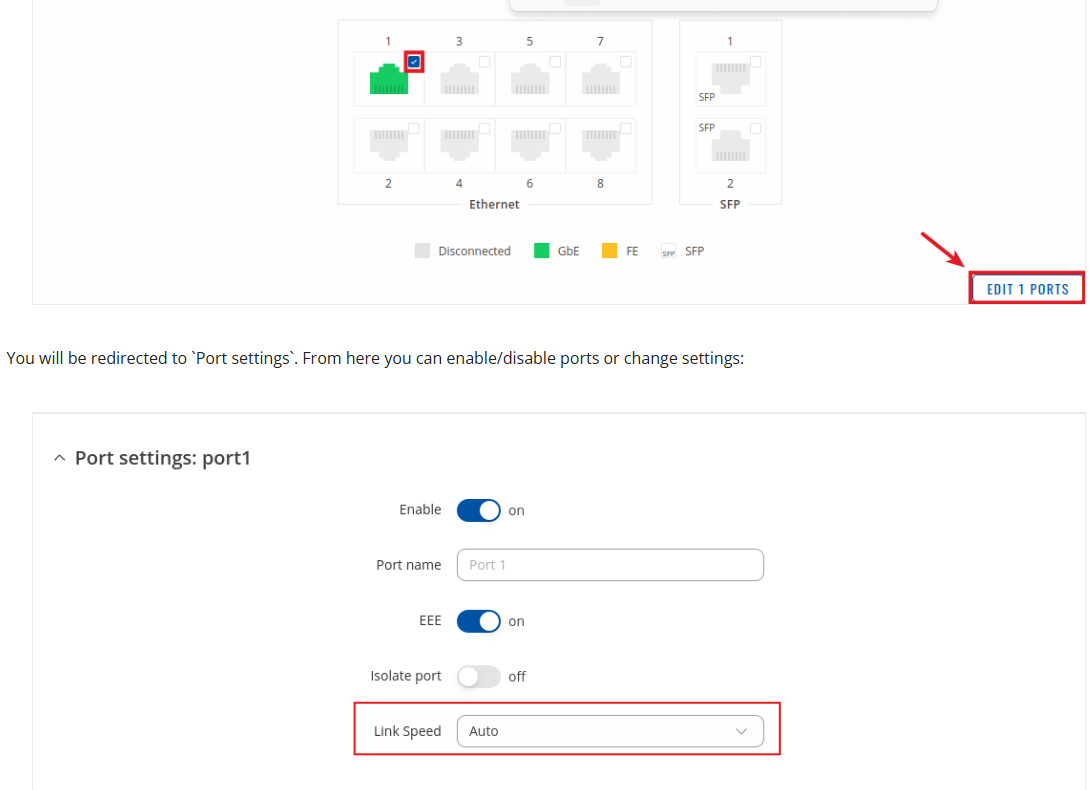 Could you please try changing the link speed of the port on the TSW212 from Auto to 1000 Mbps ? You can do this by navigating to Network → Ports → Port Settings , as shown below.