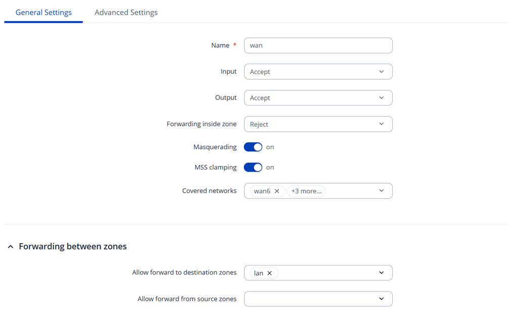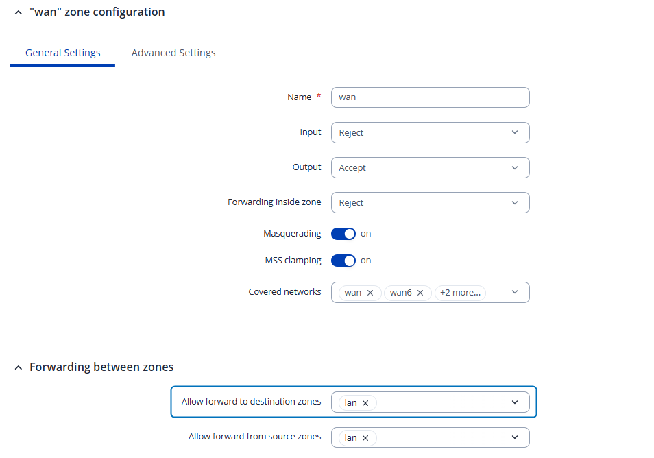 In the firewall WAN zone settings, make sure LAN zone is added to “Allow forward to destination zones”:
