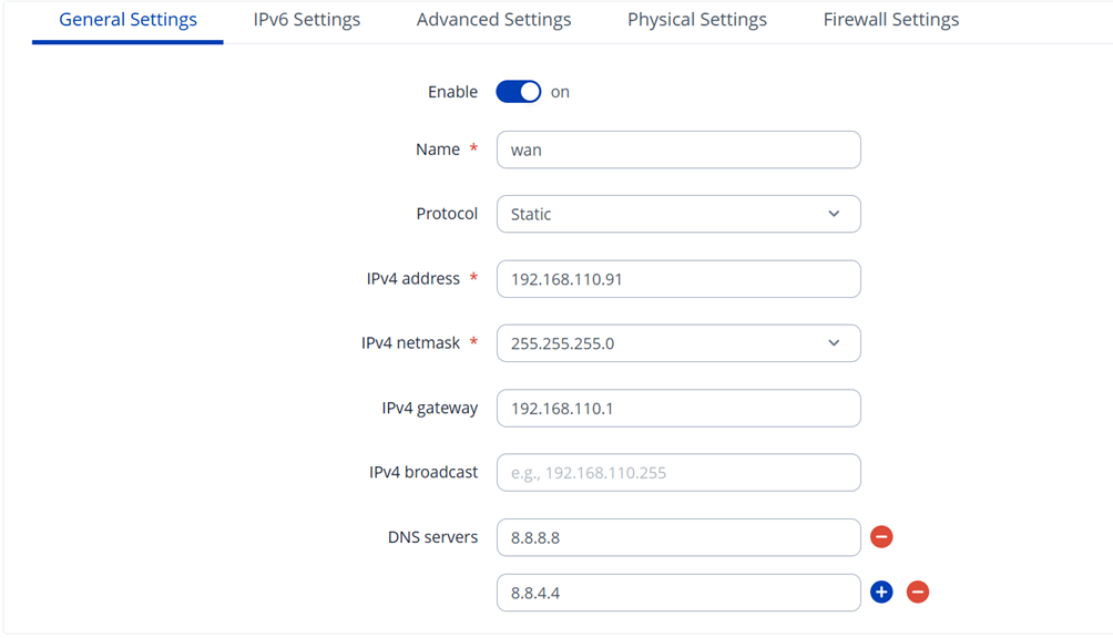 These are my WAN and LAN interface settings, and the static route I added.