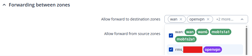 Finally, under Network → Firewall → Zones, in the LAN zone settings, the Forwarding between zones section was updated. The Allow forwarding to destination zones field must include rms. This ensures that traffic from the LAN can reach the RMS VPN.
