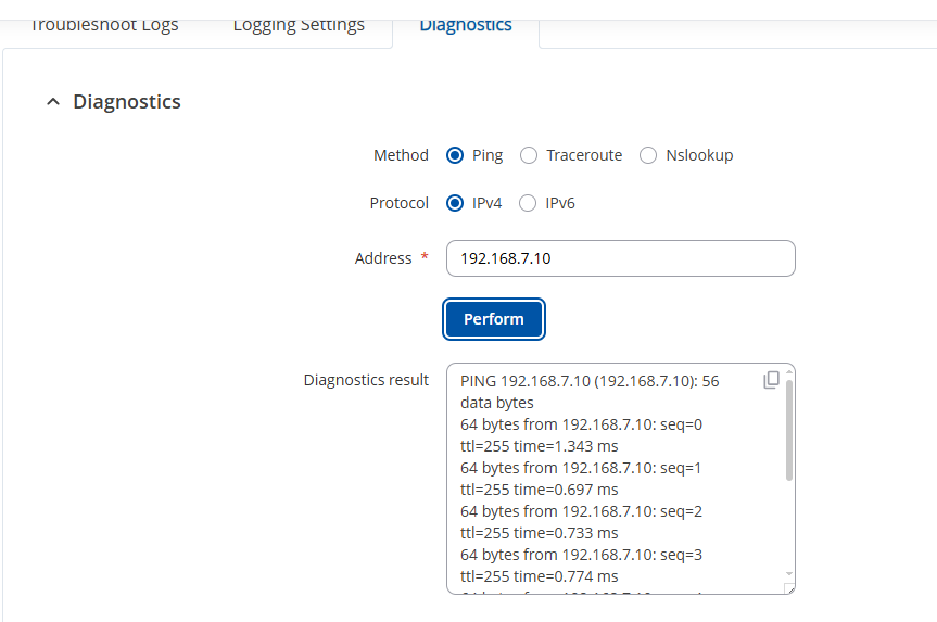 However, when I connect my laptop through the Teltonika RMS VPN, the VPN connection is established successfully, and I can access the router at 192.168.255.14. The issue is that I’m unable to ping the PLC from my laptop.