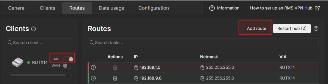 Have you enabled LAN forwarding and added a static route to the VPN hub? You can do this by navigating to Routes and clicking the buttons shown in the image below.