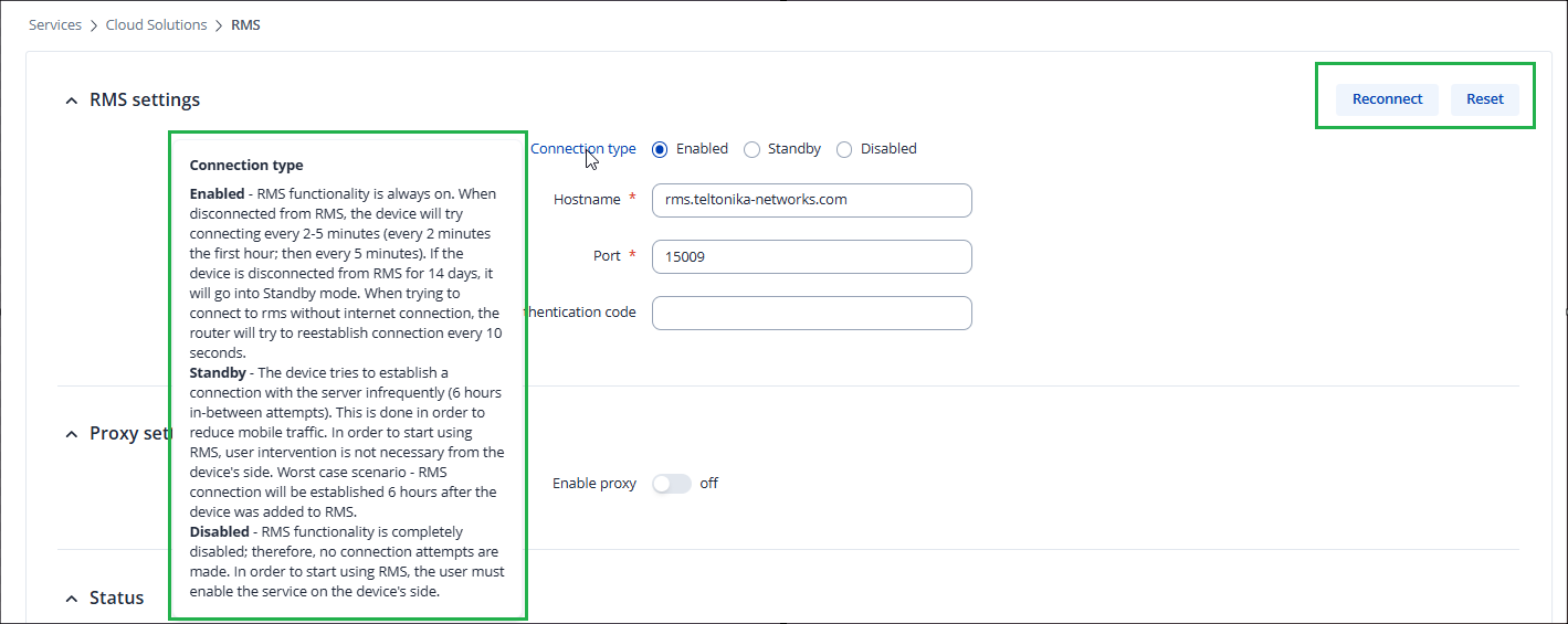 If you have physical access to the router, navigate to the “Services → Cloud Solutions → RMS” menu, and click the “Connect” button at the top right corner of the page. If you would mouse over the “Connection type” text, you will see more information about the 6-hour connection frequency:
